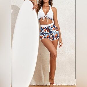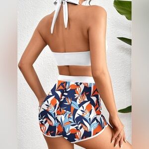 This is a new women’s size medium two-piece bikini, gorgeous orange and blue floral pattern push-up padded halter top 2025 summer season MSRP $35