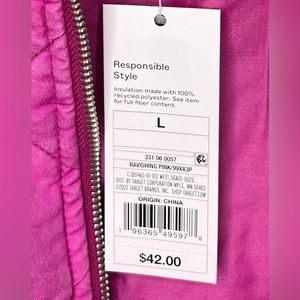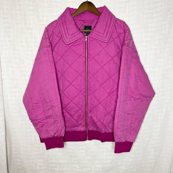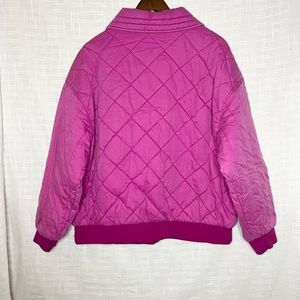 New with tags, never worn. Wild Fable bomber jacket Size Large. Diamond stitch quilted design. Ribbed hem and cuffs. Two waist pockets. Front collar with full-length zipper. Color on tag is “Ravishing Pink.” Shell- 100% Cotton