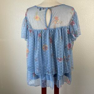 Beautiful baby doll floral lace style design on this blouse. It measures 24 inches armpit to armpit laying flat and 24 inches in length from shoulder to hem.