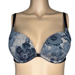 $200 NWT Wolford Leighton Push Up Bra. Denim + Black colors. Sz. 80A- 36A. A playful take on the jeans look. This push-up bra combines a floral stretch lace, on-trend denim-look design with soft and light jersey. The straps are adjustable for optimal comfort and can also be worn as a halter neck or cross-over bra. 71% polyamide, 29% elastane.