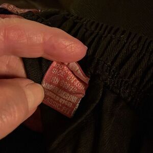 100% cotton pants. faux fly front. Elastic waistband side pockets. Heavyweight denim. Waist side to side 19.5”, rise 14” and inseam 29”.