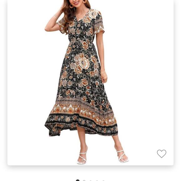 Black and brown Boho Floral print, High Waisted Beach Maxi Dress with Short sleeves, Casual, Flowy, summer dress