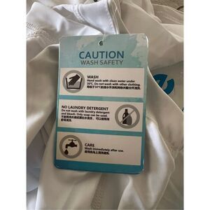 Brand new in the package, just in time for summer! this is a long sleeved, zip front rash guard, or swim top with a long sliouette and side ruching ties at the hem. This has SPF protection, although the amount is not listed. Anti UV is what the label states. Hand washable. Brand new.