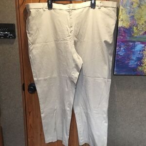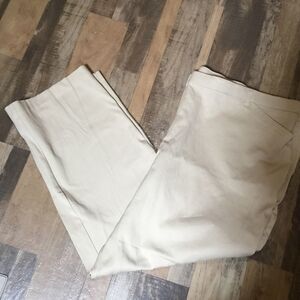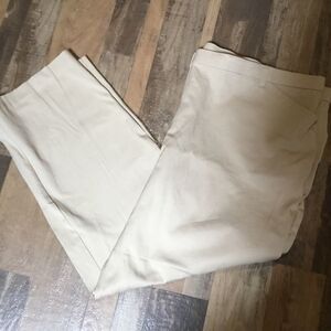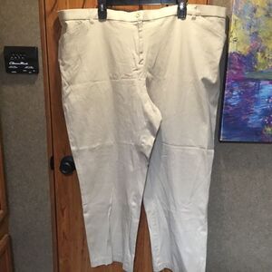 New without tags. Women’s size 24W Petite stretch kaki colored capris features cotton and spandex blend for comfort and fit. Inseam measures 28” so you can determine where they’ll fall on you. Front zipper and button closure. Two working front slit pockets. Showing photos of front and back sides along with fiber contents and care information.