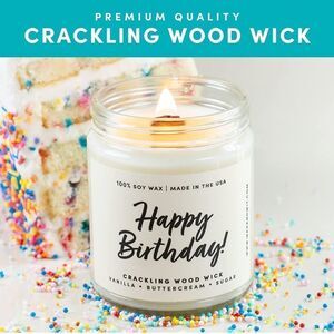 (1) Soy Crackling Wood Wick Candle reading HAPPY BIRTHDAY