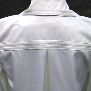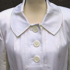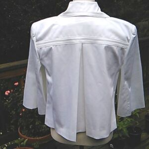 Darling off white jacket. Fully lined, big retro buttons. Beautiful seaming detail. Slightly "A" shape. Bracelet length sleeves. Pleat in back. Slightly padded shoulders. Size L measures 42 at chest, bottom hem 50. Shoulder to hem is 21, so it's a shorter look, great over dresses and skirts. Brand new and ready for Spring and Summer.