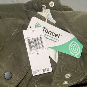 Description: This stylish Workshop Republic military-style anorak jacket is crafted from 100% Tencel for a super soft, lightweight, and breathable feel. Features a snap-front closure, adjustable drawstring waist for a flattering fit, roll-tab sleeves, and front snap pockets for a casual yet functional look. Perfect for layering during transitional weather!