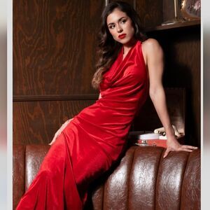 Halter dress with flowy V-neckline and open back. Back opening. Back hidden in-seam zip closure.