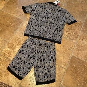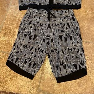 Brand new with tag. Men’s 2-piece set includes buttoned top and shorts. It’s a sweater material. Top is size medium and shorts is size small. Black and white patterned design. Comes from smoke and pet free home.