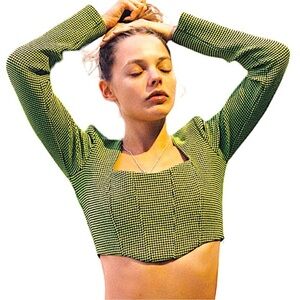 ๐๐คNWT-ZARAHoundstooth Neon Green Crop Corset Bustier Long Sleeve Top Sz S๐๐ค