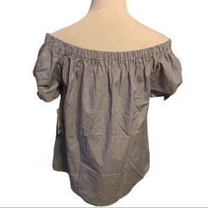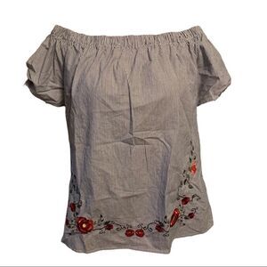 Zac & Rachel striped top in 100% cotton with tie embellishment on the sleeve, elastic neckline so it can be worn off the shoulders and embroidery design. Armpit-to-armpit 22” and length 23”. Brand new with tags still attached!