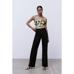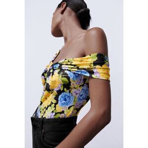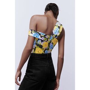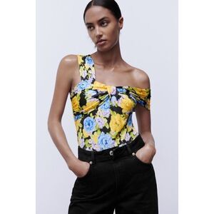 NWT Zara Blue & Black Floral Printed Asymmetric Neckline Bodysuit with Knot