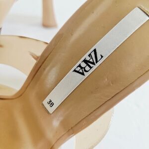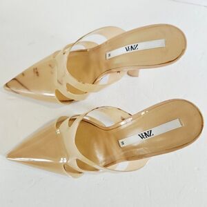 NWT Zara Pointed Toe Vinyl Nude Cut Out Slip On Kitten Heel Mule Sandals 38 FLAW