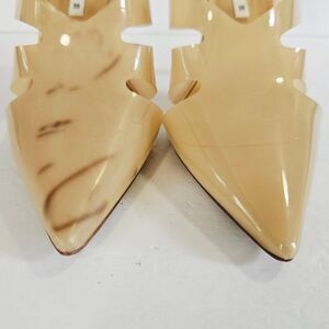 Vinyl heeled mules. Pointed toes. Nude color with a cut out design. Slip on style. Features AIRFIT®. Technical flexible latex foam insole designed to offer increased comfort. These are brand new with the tags. They in excellent condition other than some brown markings on the vinyl. I am not sure if they can be removed.