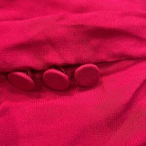 Long sleeve, shoulder pads, round neckline, peplum waist, open V back that ties at the shoulder blades, rhinestones at ties, button detail at cuffs and soft gathering at the front neckline and waist for a flattering fit