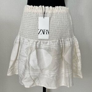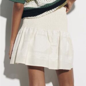 Short skirt made of viscose and linen blend fabric. High-waisted with elastic waistband. Tonal embroidered detail. 70% viscose, 30% linen. Waist to hem approx 17” long. *Brand new with tags. Authentic brand