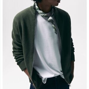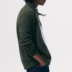 Long sleeve mock neck cardigan in khaki color. Rib trim. Zipper closure. *Brand new with tags. Authentic brand