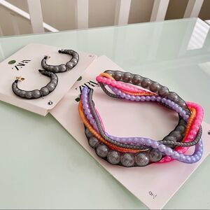Interwoven necklace covered with mesh with different sized faux pearls inside. Lobster clasp closure. Hoop earrings covered with mesh with faux pearls inside. Butterfly closure. *Brand new with tags. Authentic brand