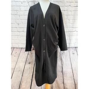 Long jacket made with flexible stretch fabric with dense, soft, and opaque weave. V-neckline and long sleeves with dropped shoulders. Ruching at waist. Front button closure.
