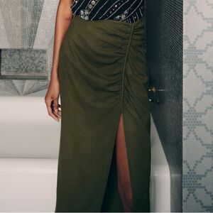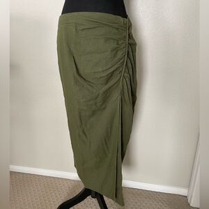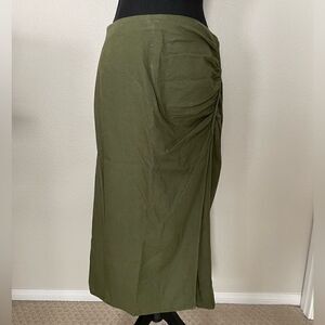 Skirt made of linen blend fabric. High-waisted with ruching at front. Front slit at hem. Side hidden in-seam zip closure. Waist approx 15” across. Waist to hem approx 32.5” long. 50% viscose, 50% linen fabric. *Brand new with tags. Authentic brand