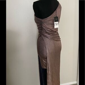 Long sleeve dress with asymmetric neckline. Side ruching at waist and side slit with asymmetric hem. Stretchy fabric. Bronze color. *Brand new with tags. Authentic brand