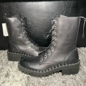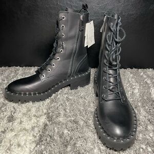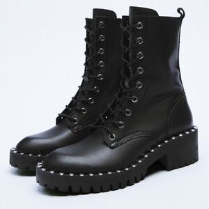 Low heel leather ankle boots in black. Leather upper with studs around the sole. Back pull tab. Front laces. Inner side zip closure. Airfit technical flexible latex foam insole designed to offer increased comfort. Heel height 2”. Upper 93% cow leather, 7% polyester. Insole 100% goat leather. Tongue 100% cow leather. Sole 100% thermoplastic rubber. *Brand new with tags. Authentic brand