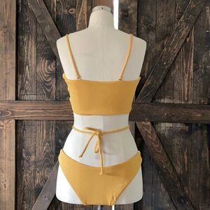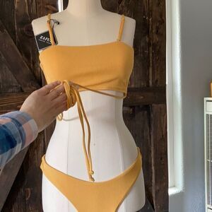 New with tags and in package, sculpting ribbed fabric, the bandeau top is suspended by adjustable spaghetti straps (which can be removed for tanning purposes) and thin straps wrap under the hem, as well as complementing high-leg bottoms that finish with a demure-coverage back.