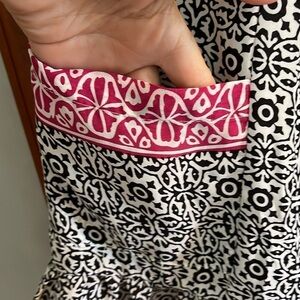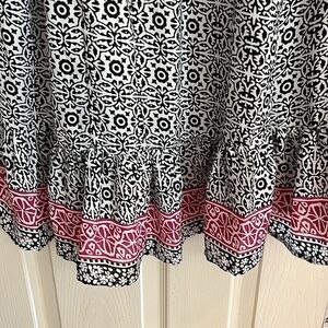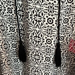 NWT-charming Charlie-L-Black/white/pink floral-baby doll 3/4 sleeve, tassel tie neckline, dress. lightweight, two pockets in the front. Ruffle bottom. super cute! 100% polyester. See photos for approximate flat measurements.