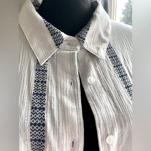 White linen button down shirt with blue lines running up and down. Eased fit.
