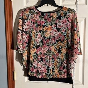 NWT-cure-S-black tank top with flowy sheer multicolored floral design top/blouse . 95% polyester 5% spandex. See photos for approximate flat measurements. Great blouse for the office or a night out with friends.