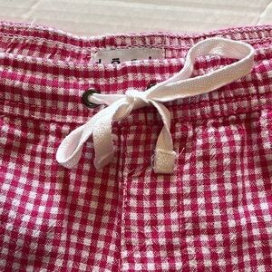 NWT-da-sh-M-Fuchsia/white-gingham, linen blend, high-rise, cuffed shorts. Elastic with drawstring waist. side pockets. Two pockets in the back. Lightweight. 55% linen, 45% rayon. See photos for approximate flat measurements.