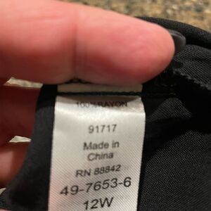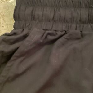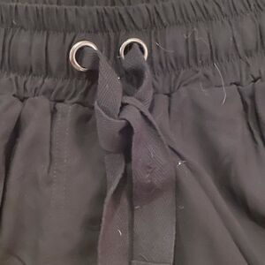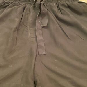 100% rayon. Elastic waist with a drawstring. Two front pockets. Waist measures 27 inches and length is 18 1/2 inches.