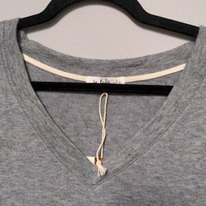 Gray v neck sweater. Slight balloon sleeve, stitched hems, small side slits