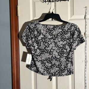 NWT-no comment NY.LA-Large-Black with floral pattern, front tie, crop top. Short sleeve. Lightweight. 61% polyester, 33% rayon, 6% spandex. See photos for approximate flat measurements.