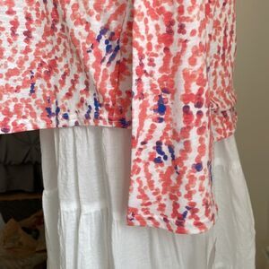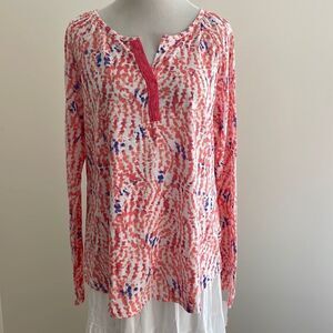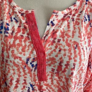 NWT Salmon and blue random dots with split V neck top with lace accent long sleeves stretchy by basic edition women’s large