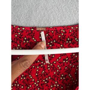 New with Tags (NWT) Free People Clara Floral Print Tunic Faux Wrap Red Mini Dress, size XS. This vibrant red mini dress features a delicate floral pattern, perfect for a chic and playful look. With its V-neck and faux wrap design, it offers a flattering silhouette. The dress has long sleeves with button cuffs and a tie detail at the waist for an adjustable fit. Made from a lightweight fabric, it's comfortable for everyday wear or special occasions. Excellent new condition with original tags attached.