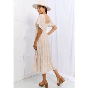 This enchanting dress is a perfect blend of femininity, elegance, and comfort, designed to make you feel like a true fashion icon. This midi dress showcases a stunning ditsy floral pattern that adds a touch of whimsy to your wardrobe. The vibrant and colorful flowers dance across the fabric, creating a lively and captivating look. The tiered ruffle design adds an element of playfulness and movement to the dress. With each step, the ruffles gracefully cascade down, creating a flattering and romantic silhouette. The bust ruching detail accentuates your curves and adds a subtle allure to your overall appearance. The flare sleeves of this dress exude a sense of vintage charm. They beautifully frame your arms and add a touch of drama to your ensemble, making you feel effortlessly chic and sophisticated. The smocked back ensures a comfortable and adjustable fit, hugging your body in all the right places. We understand the importance of practicality, which is why we've added side pockets to this dress. You can easily store small essentials or slip your hands inside for a relaxed and casual look. No need to carry a purse when you have this convenient feature!