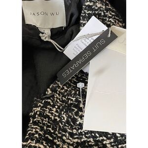 This is a Jason Wu tweed midi skirt in size 8 for women. The skirt is black and white with an A-Line style and features a zipper closure. It is made from a blend of polyester, acrylic, luxury yarn, viscose, and cotton. The fabric type is tweed, giving it a textured appearance.New w/tags part of the Jason Wu Separates Collection.Measurements:Waist-29"Length-35"