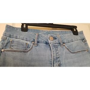 Seven7 Jeans Women's Tummy Less Denim Jeans - Size 8; Material - 81% Cotton, 17% Polyester, 2% Spandex; Care - Machine wash Cold Inside Out Gentle Cycle Line Dry; Made in China; Color Alaska, Distressed at Each Knee, Tummy Less Skinny (Inner Slimming Control Panel). High Rise, Logo, 5 Pockets, Logo, Studded, Zipper & Button Closure, Belt Loops, Stretch, Skinny, Medium Wash,