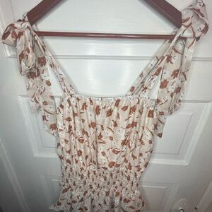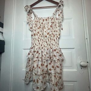 You'll look beyond darling in the MinkPink Elena Mini Dress from L. Mae Boutique. Lightweight, woven fabric shapes this dress that has adjustable tie straps, a square neckline, and a smocked bodice. A high elastic waistband tops an A-line mini skirt with tiers of ruffles. Pair with cowgirl boots, a denim jacket, and a rancher hat for a rustic bohemian look.