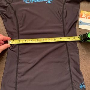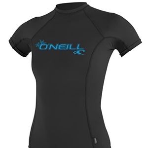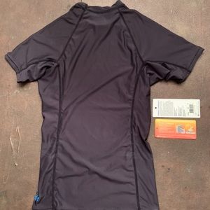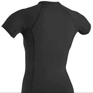 New with Unattached Tags Basic Skins S/S rash guard, as represented in photos. The fit is extra tight, for a cute and sexy look. Is size S, & can also fit XS. 89% Polyester 11% Elastane. Never worn, but has deodorant marks from being tried on. Length from front neckline to bottom is 21-1/2” as pictured.