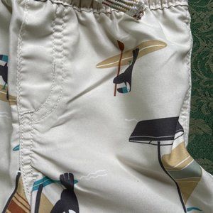 green tan reads AHOY THERE penguin or toucan on a boat boats theme sailboats fish ocean beach theme shirt matching swim trunks swimming trunks bathing suit for boys