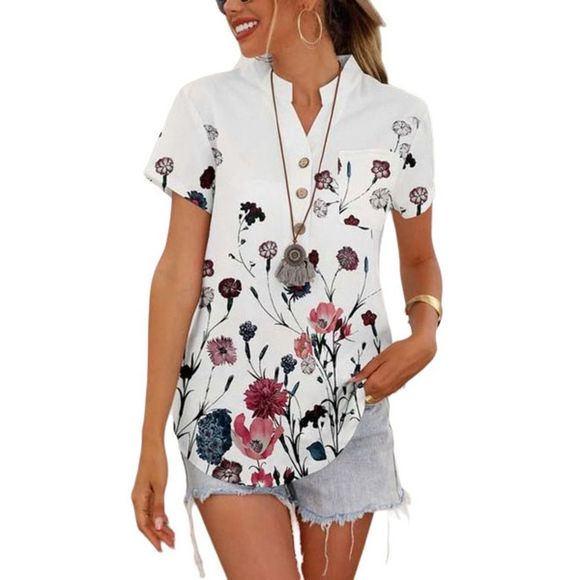 * Design: White Top with Pink Floral Print and Front Buttons