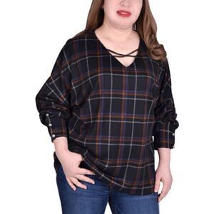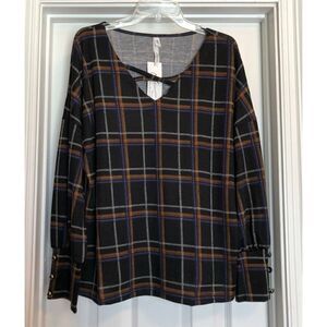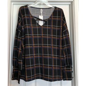 Cute long-sleeve, V-neck, plaid, crisscross neckline top by NY collection in ladies size 1X. It has 4.5” cuffs with round metal button details. Black plaid with shades of blue and rust. MSRP $40. It’s 95% polyester and 5% spandex, so it’s machine washable. The pit-to-pit measurement is 26”, the sleeves are 21” and the length is 26”. This is an adorable top and it’s NWT!