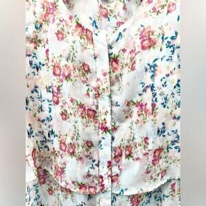 Tags NY Collection blouse, floral ruffle blouse, romantic top, cottagecore shirt, rose print top, spring blouse, short sleeve button top, lightweight floral shirt, feminine ruffle blouse, business casual