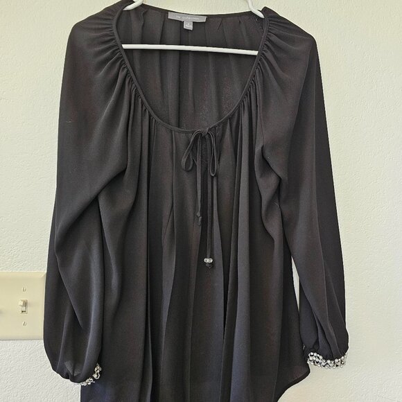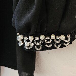 NY COLLECTION Women's Size M Black Blouse Pearls Rhinestone Cuffs Long Sleeves