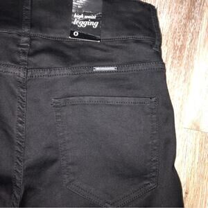 Black denim high waist leggings from New York & Co. Double button and zipper closure. Two back pockets. Two front zippered diagonal pockets provide a flattering fit and detail. Silver hardware. Brand new with tags!