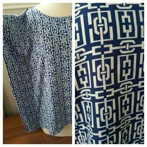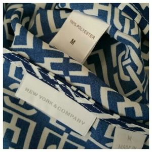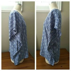 NY & CO Blue and White Greek Key Print Poncho Style Top in EUC with no flaws. Beautiful bold print, great to pair with a pencil skirt for the office, or have fun and pair with red or white for a fun day out. Measurements are: Length is 27", Bust width is 20", waist width at the bottom is 22", Sleeve Length is approximately 5"-7".