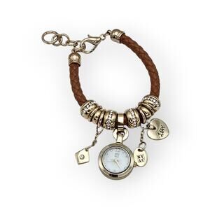 NY & Co Charm Bracelet Watch – Brown Braided Leather – Gold Tone – Rhinestone Accents