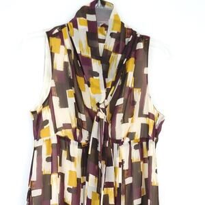 NY & Co Dress Abstract Print Career Sleeveless SZ 4 Multicolor, Neck Tie, Loose Fit. Colors are like a dark eggplant purple, brown, yellow, cream. Side zip. Vneck. 100% polyester